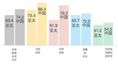 —— 其中,中国在农业生产波动(得分98.6)、供应便利性(得分89.3)和对食品安全和可及性的政策保障(得分100)等指标上的表现达到了“非常好”区间。